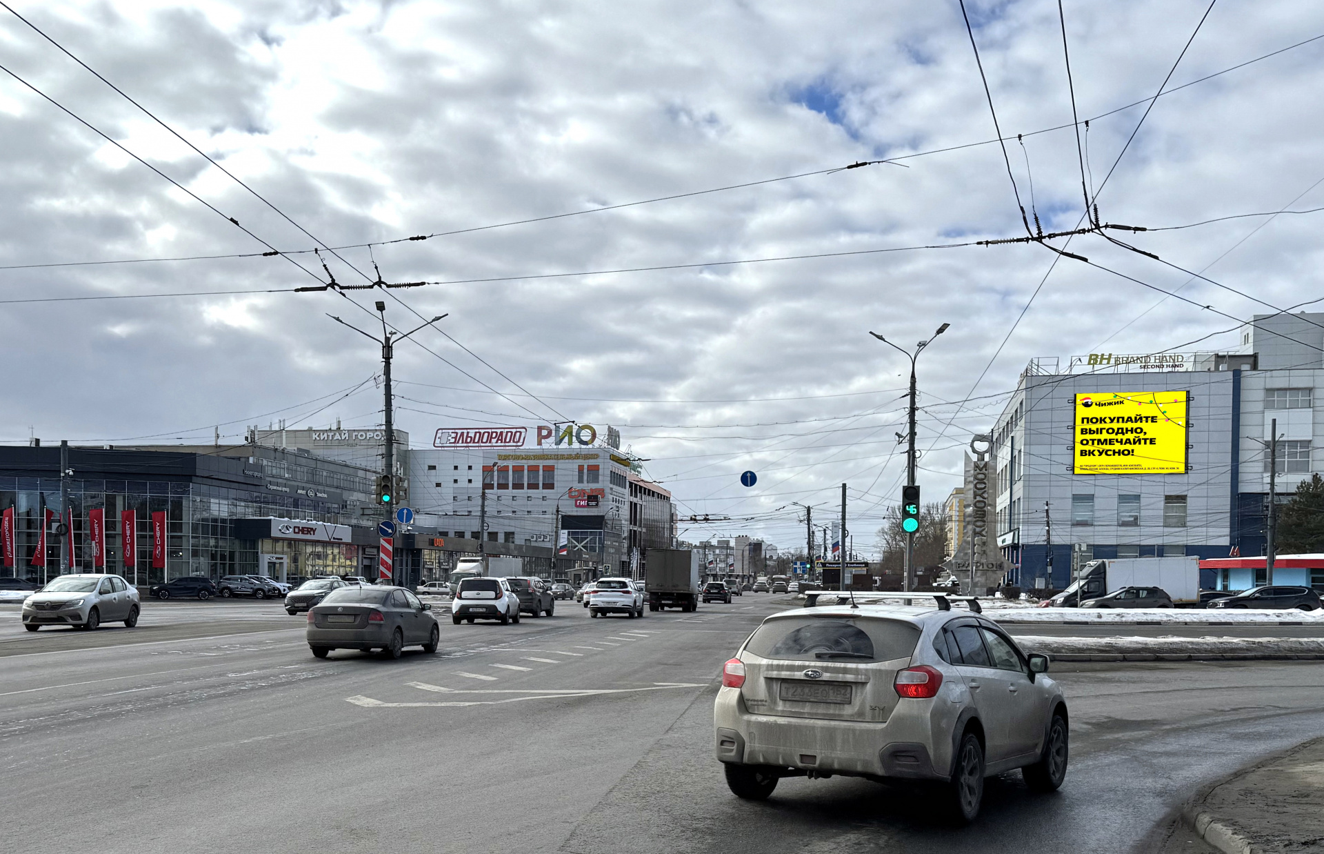 Крупная транспортная развязка, отличная просматриваемость, плотный транспортный поток в течение всего дня, пробки в часы пик. Рядом расположена станция метро, остановки общественного транспорта, ТЦ Новая Эра, ТРЦ Рио.
